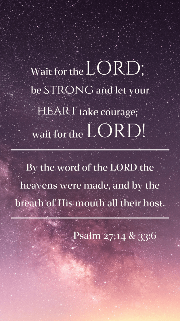LORD, You are my shield and my protector; by Your word, all things were created. I will be strong and courageous as I wait for You. I put my trust in You.