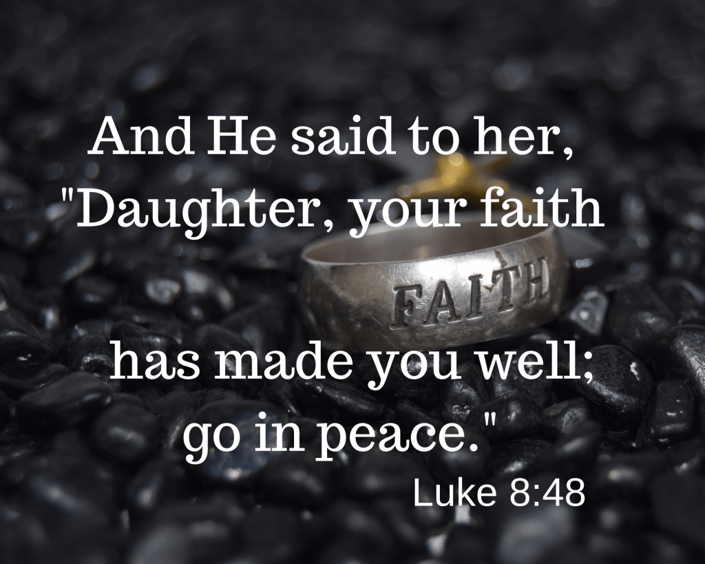 Can you feel it? Can you feel the love and compassion flowing through Christ? Jesus was on His way to heal the daughter of Jarius, an official of the synagogue and yet He stopped and spoke to this woman. Jesus affirmed what this woman confessed, that when she touched His cloak she was immediately healed. Jesus said her faith made her well and to go in peace. In other words, don’t be afraid. You chose to believe and by faith you followed through which led to your healing. I can’t help but to wonder why Jesus said to go in peace. Was it for her benefit or that of the people surrounding them? Was it to keep the people from trying to harass her after He was gone? Maybe He didn’t want her to feel embarrassed over running after Him to heal her. He wants us to run after Him. He wants us to seek Him, to find Him, to follow after Him, and to share the Good News with others.